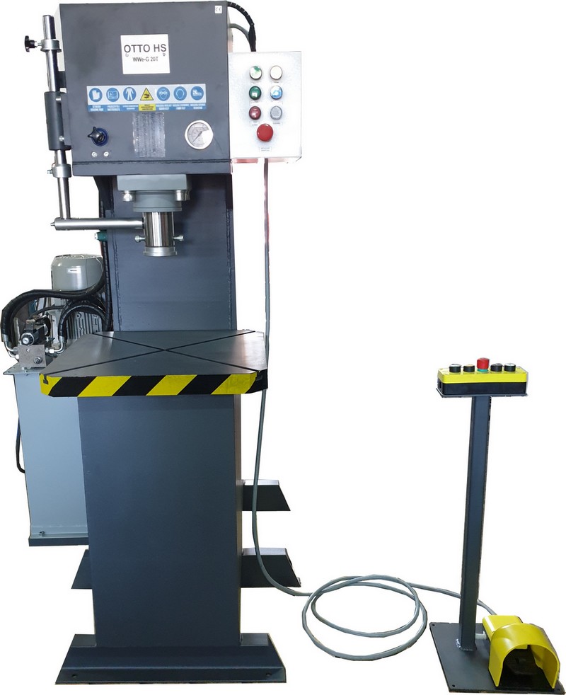 Prasa hydrauliczna wysięgnikowa (typu „G”) przeznaczona do ściskania, charakteryzuje się dużą szybkością przesuw tłoczyska siłownika i łatwym dostępem do przestrzeni roboczej. Urządzenie sterowane ręcznie przy pomocy manetki rozdzielacza ręcznego i przycisku zasilania (praca dwu ręczna), oraz awaryjnego wyłącznika bezpieczeństwa i zaworu regulacji maksymalnego ciśnienia. Urządzenie wyposażone w siłownik dwustronnego działania z przedłużonym tłoczyskiem. Tłoczysko zakończone otworem pod nasadkę trzpieniową mocowaną śrubami bocznymi. Prasa wyposażona w blat roboczy, który wyposażony jest w otwór przelotowy i cztery montażowe otwory gwintowane. Pod blatem znajduje się wysuwana szuflada na odpadki obróbkowe.